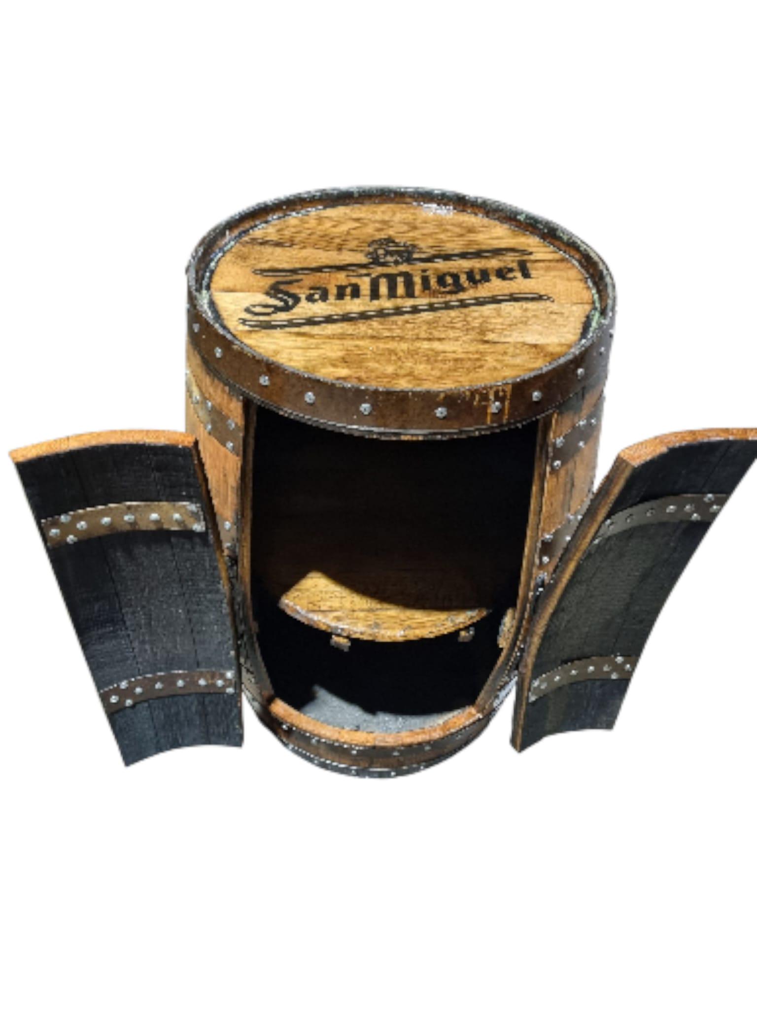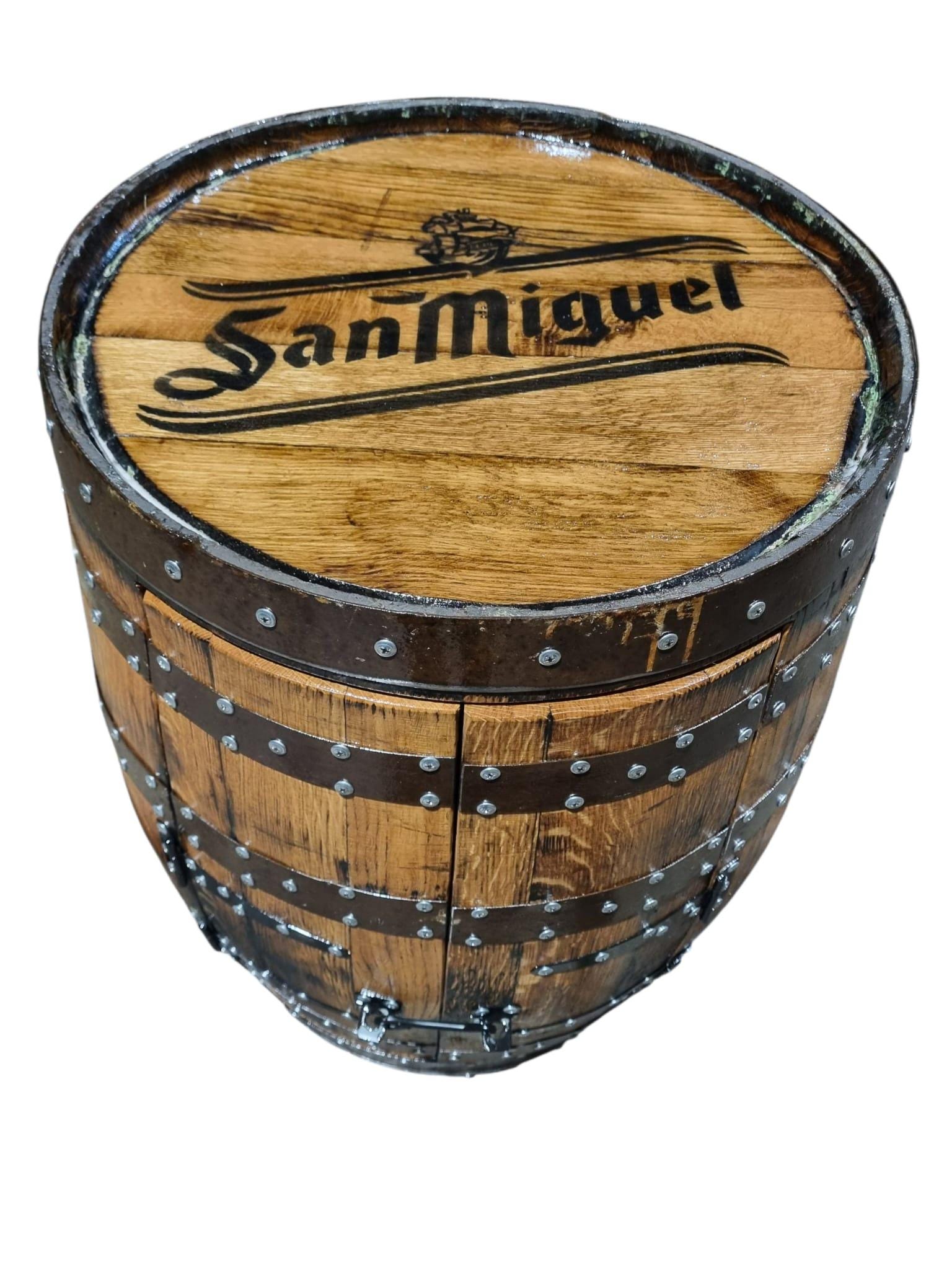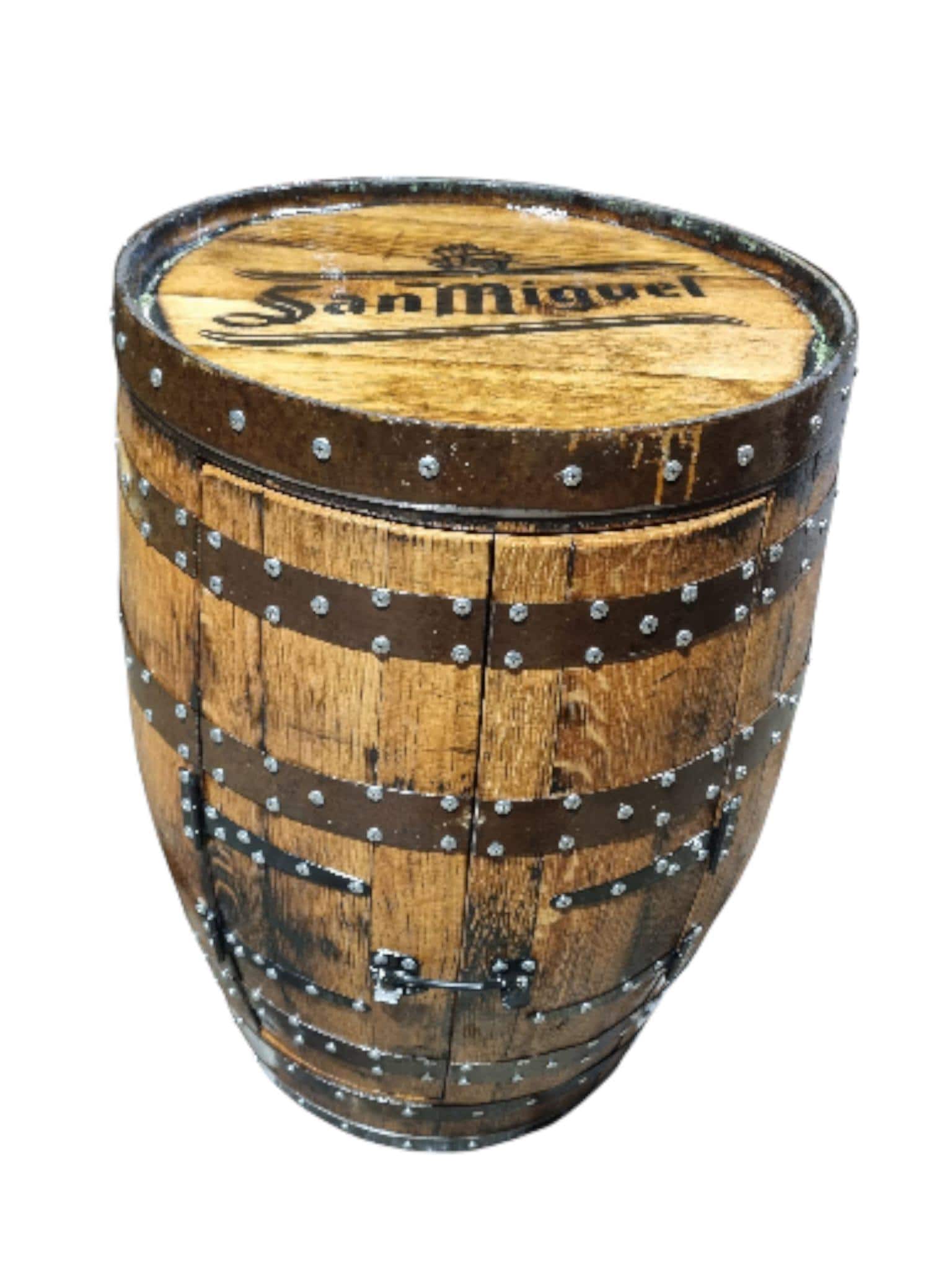 SAN MIGUEL LAGER Branded - Rustic Bourbon Barrel Cask Handcrafted Drinks Cabinet / Home Bar / Man Cave