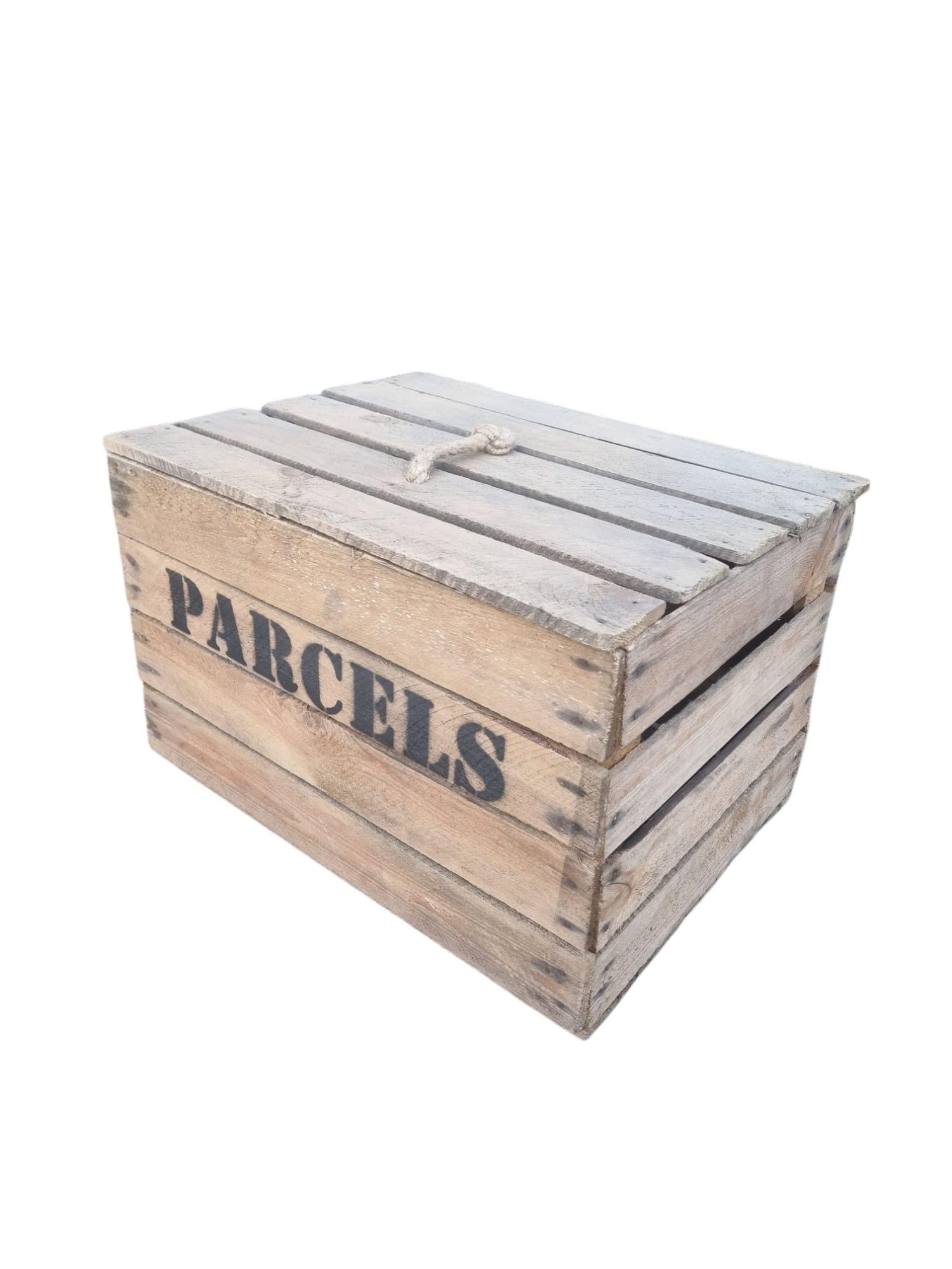 Comes with a lid with rope handle The crate is suitable for outdoor use, however only within the confines of a sheltered area such as a porch, as this is not waterproof. A nice rustic solution to receiving your parcels and post